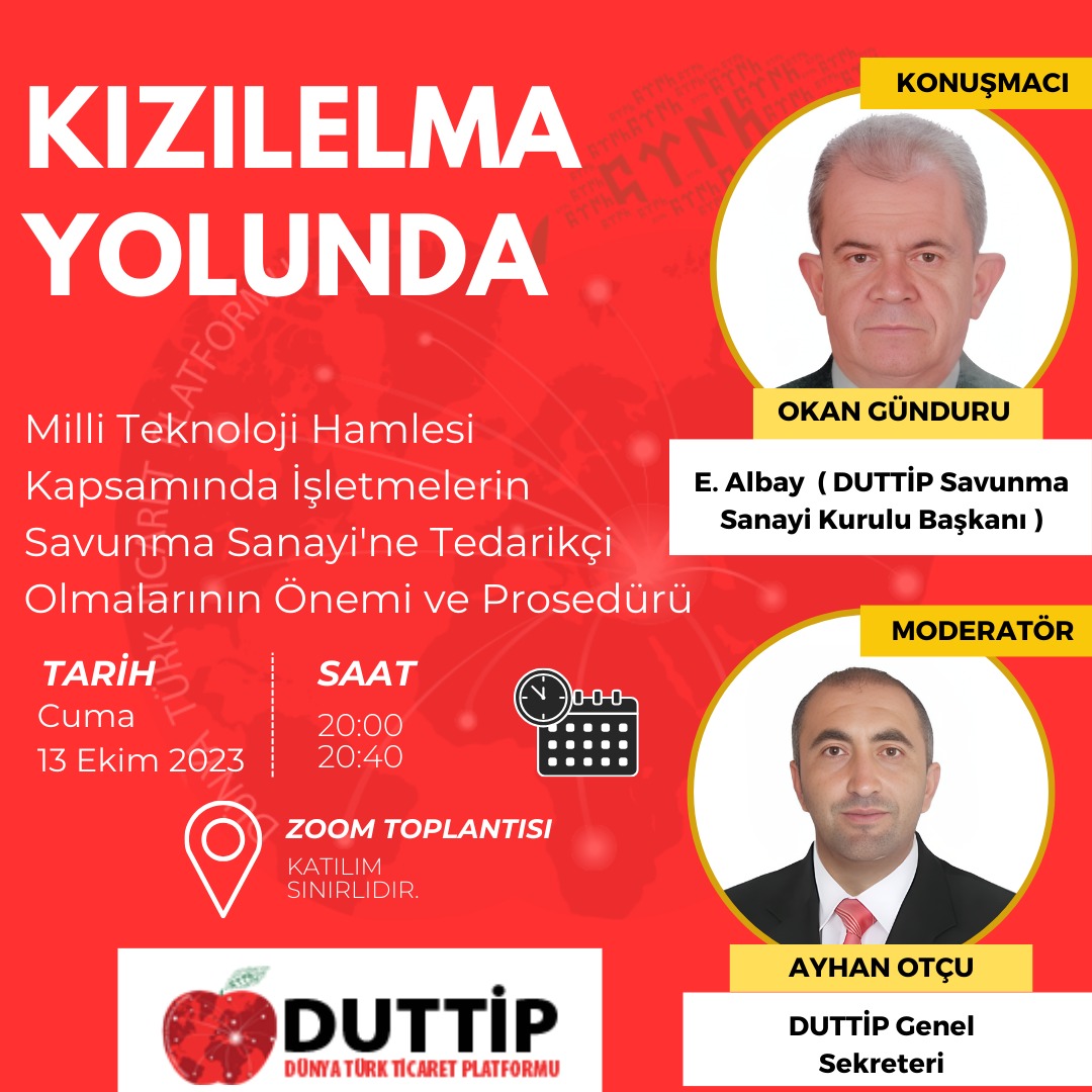 13 Ekim 2023 Cuma akşamı düzenlenecek olan özel bir toplantıda, Milli Teknoloji Hamlesi kapsamında işletmelerin savunma sanayine tedarikçi olmalarının önemini ve prosedürleri ele alınacak. Toplantının moderatörlüğünü Duttip Genel Sekreteri Ayhan Otçu yapacak.